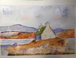 For this watercolour I used A4, then sketching the outlines of the cottage's, using a wash of raw sienna and indigo, adding more blue to the sky. Working on the far hills with greens and burnt umber.